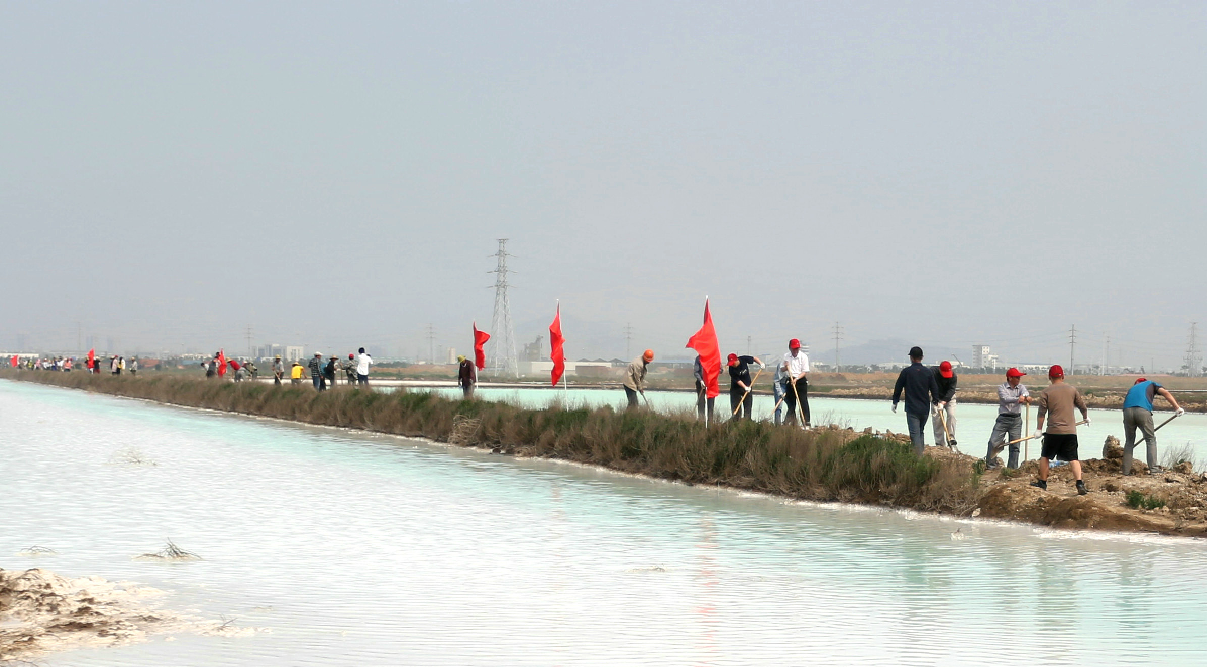 6月13日下午,來自公司機(jī)關(guān)第一、第二黨支部及臨達(dá)公司、海州灣公司、金臺(tái)公司、海濱工區(qū)等六個(gè)黨支部的百余名黨員志愿者,自行解決交通工具和勞動(dòng)工具,頂著炎炎烈日,齊聚242省道北側(cè)1公里處的臨達(dá)公司新建鈣液輸送管道現(xiàn)場(chǎng),“一”字型排開,在近600米的溝堰上展開管道鋪設(shè)溝道回填土工程,場(chǎng)面蔚為壯觀。