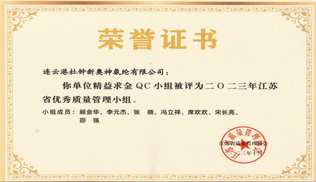 杜鐘氨綸一精益求金QC小組榮獲2023年江蘇省優(yōu)秀質(zhì)量管理小組稱號(hào)