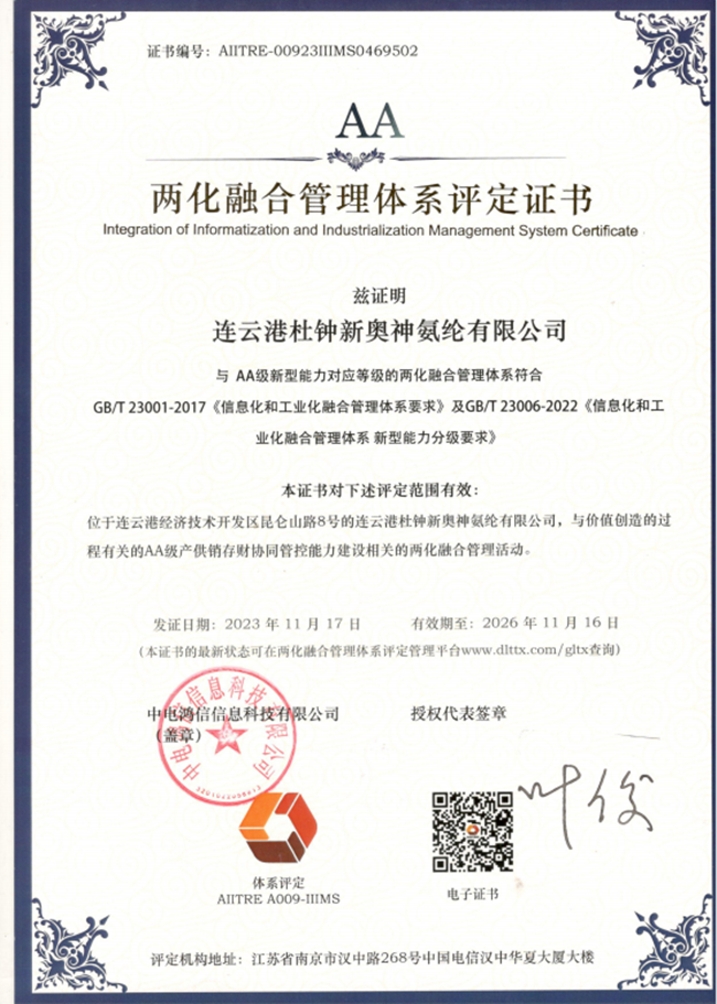 杜鐘氨綸公司于2023年11月17日取得了AA級(jí)兩化融合管理體系評(píng)定證書(shū)。該證書(shū)覆蓋了與價(jià)值創(chuàng)造的過(guò)程有關(guān)的AA級(jí)產(chǎn)供銷(xiāo)存財(cái)協(xié)同管控能力建設(shè)相關(guān)的兩化融合管理活動(dòng)。