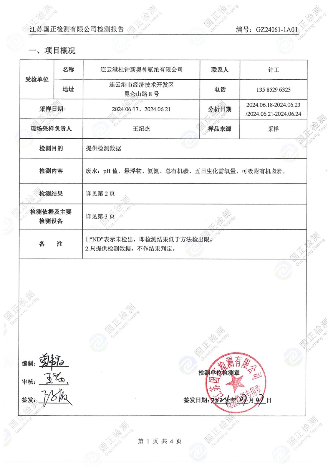 杜鐘氨綸2024年6月排污檢測報(bào)告