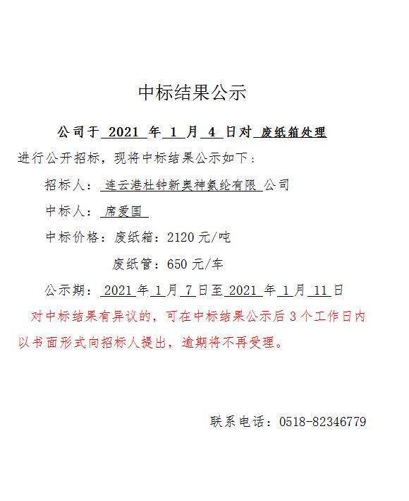 廢紙箱處理中標結(jié)果公示