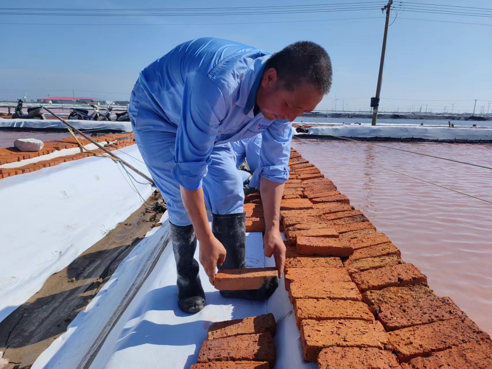 鏖戰(zhàn)酷暑,保目標當前,正是原鹽生產(chǎn)的關(guān)鍵時期,面對高溫酷暑的嚴重考驗,該公司干部職工迎難而上,戰(zhàn)高溫斗酷暑、搶晴天保生產(chǎn),全力投入到高溫生產(chǎn)、保鹽保鹵等工作中,及時修補塑布,加強塑布收放系統(tǒng)維護保養(yǎng),隨時做好拉塑布準備工作;管理人員以上率下,實施24小時現(xiàn)場值班機制,強化除硫制鹽工藝,抓實抓細原料鹵水、結(jié)晶池等源頭過程管控,確保全年產(chǎn)鹽60萬噸。驕陽烈日下,萬畝銀灘鹵水潺潺、“五彩斑斕”,產(chǎn)業(yè)工人在39℃高溫的戶外勞作,在熱氣蒸人的鹵水鹽田里,揮汗如雨,構(gòu)成了一幅最美的“鹵上芭蕾”。(許東彥)
