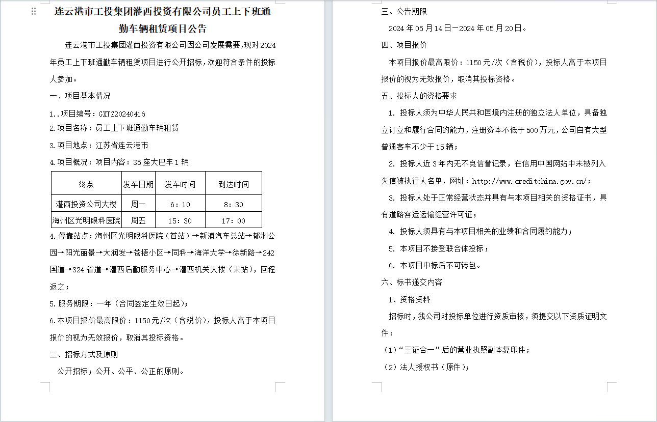 連云港市工投集團(tuán)灌西投資有限公司員工上下班通勤車輛租賃項(xiàng)目公告