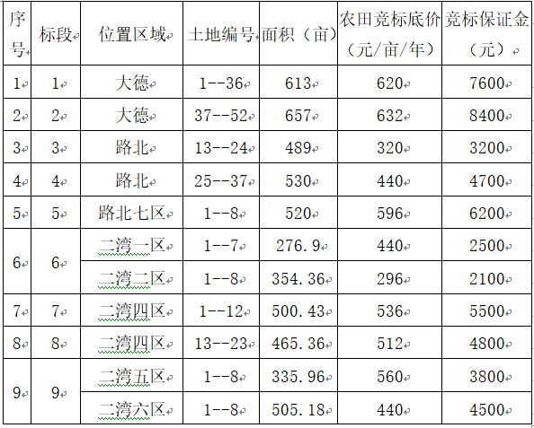 一、競標農(nóng)田標段、位置、面積、競標底價、競標保證金: