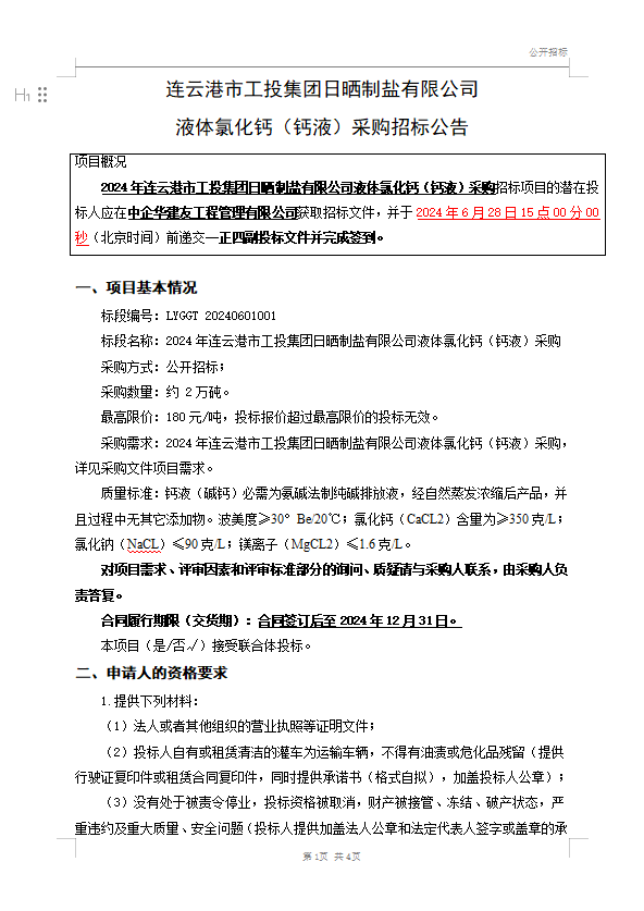 日曬制鹽公司 液體氯化鈣(鈣液)采購招標公告