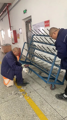 維修臺(tái)車時(shí),我當(dāng)起了孫師傅的下手,一邊將臺(tái)車穩(wěn)住不能傾倒,一邊看著孫師傅卸下每個(gè)車輪子并進(jìn)行仔細(xì)清理不怕臟、不怕累,毫無怨言,一絲不茍動(dòng)作利落,手法嫻熟親身直面他的高效率和專業(yè)水平。還對(duì)我詳細(xì)解說,讓我理解每個(gè)步驟的重要性和關(guān)鍵點(diǎn)。我們蔣姐也過來幫忙,不停的清掃臺(tái)車上清理出來的垃圾……