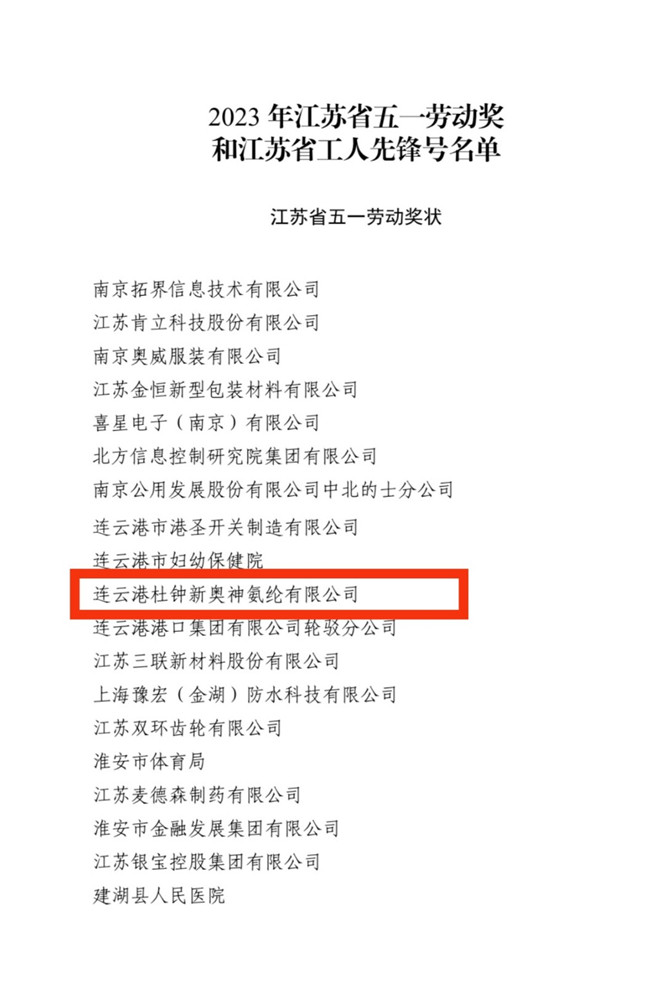 近日,江蘇省總工會發(fā)布《關(guān)于表彰2023年省五一勞動獎和省工人先鋒號的決定》,氨綸公司被授予“江蘇省五一勞動獎狀”榮譽(yù)稱號。