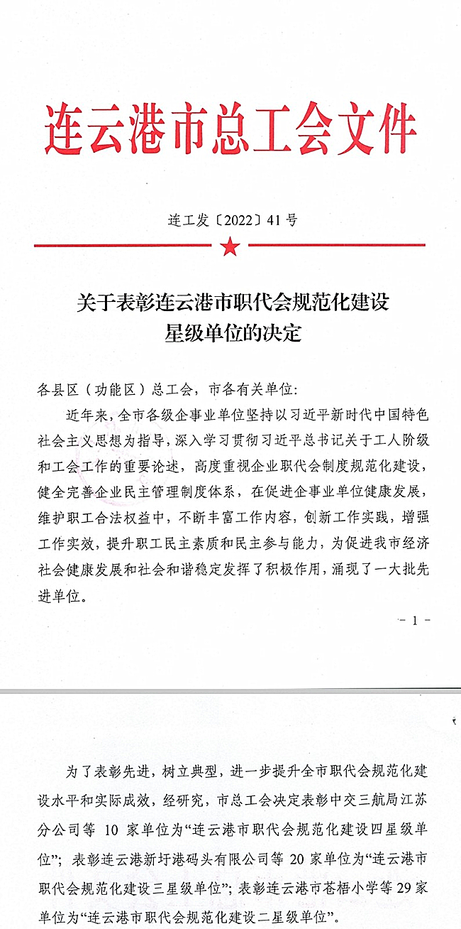 日前,從連云港市總工會傳來喜訊,我公司工會被授予“四星級職代會”榮譽(yù)稱號。