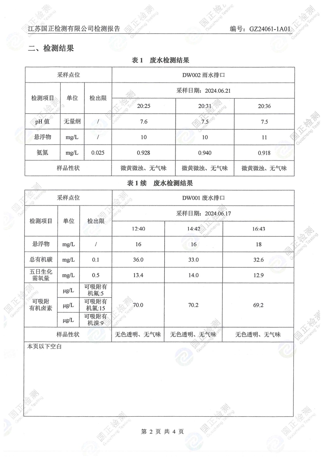 杜鐘氨綸2024年6月排污檢測報(bào)告