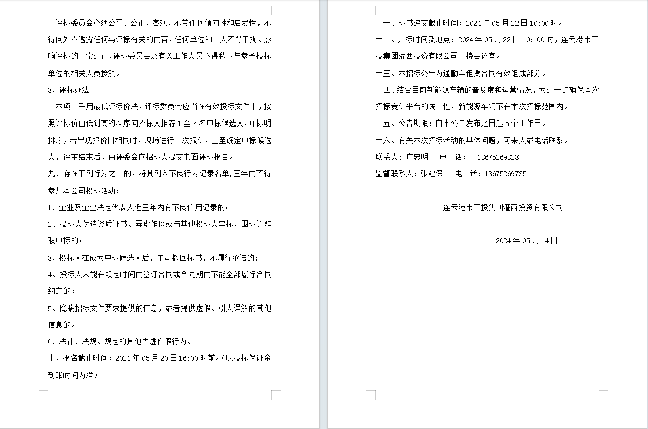 連云港市工投集團(tuán)灌西投資有限公司員工上下班通勤車輛租賃項(xiàng)目公告