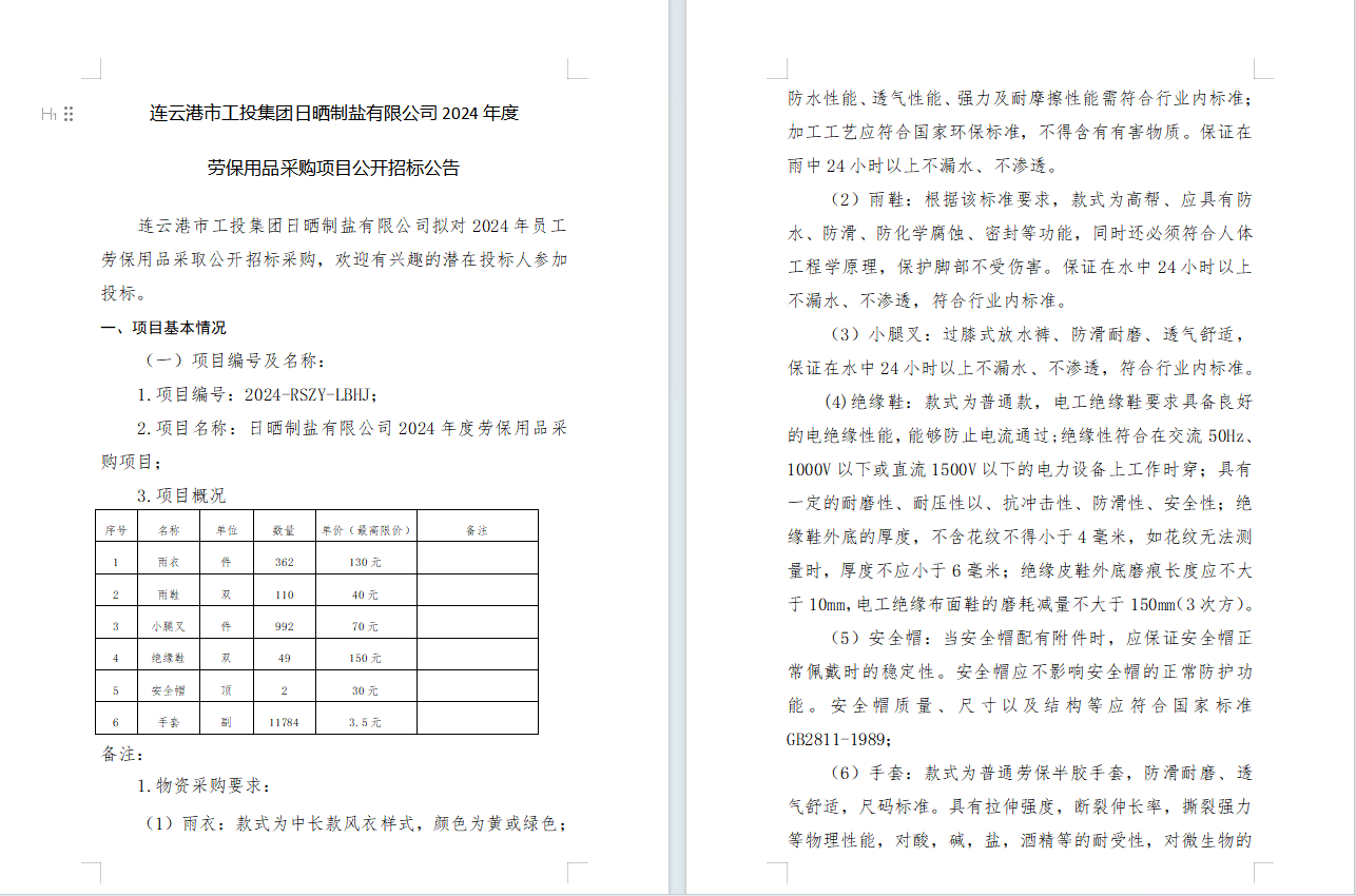 連云港市工投集團(tuán)日曬制鹽有限公司2024年度勞保用品采購項(xiàng)目公開招標(biāo)公告