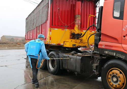 加工鹽車間副主任李畢軍正在對外來車輛進行消毒。