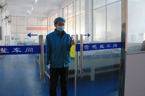 雪花鹽車間主任助理萬平正在對車間關鍵區(qū)域進行消毒。