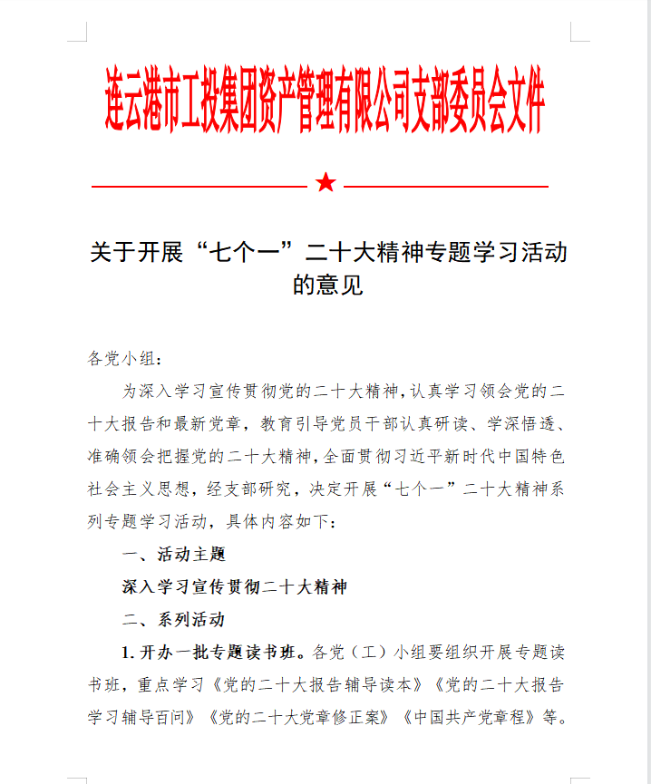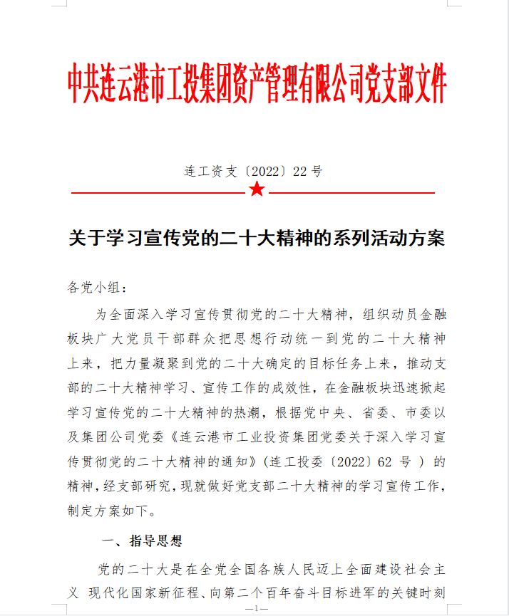 為在金融板塊快速掀起學(xué)習(xí)宣貫黨的二十大精神熱潮,支部精心組織、積極籌劃,完善學(xué)習(xí)方案,創(chuàng)新學(xué)習(xí)教育形式,豐富黨建活動(dòng)載體,支部結(jié)合公司實(shí)際,專門制定《學(xué)習(xí)宣傳貫徹二十大精神學(xué)習(xí)方案》、《關(guān)于開展“七個(gè)一”二十大精神專題學(xué)習(xí)活動(dòng)的意見(jiàn)》。