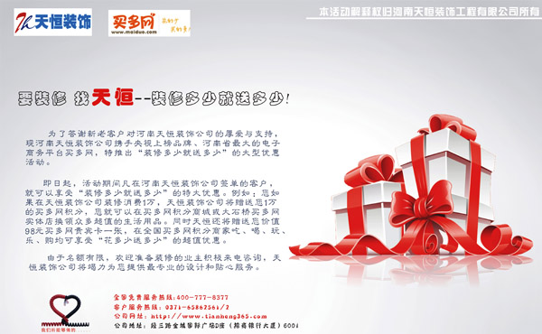 為了答謝新老客戶對河南天恒裝飾公司的厚愛與支持,現(xiàn)河南天恒裝飾公司攜手央視上榜品牌、河南省最大的電子商務平臺買多網(wǎng),特推出“裝修多少就送多少”的大型優(yōu)惠活動。 即日起,活動期間凡在河南天恒裝飾公司簽單的客戶,就可以享受“裝修多少就送多少”的特大優(yōu)惠。比如:您如果在天恒裝飾公司裝修消費1萬,天恒裝飾公司將贈送您1萬的買多網(wǎng)積分,您就可以在買多網(wǎng)積分商城或大石橋買多網(wǎng)實體店換領眾多超值的生活用品。同時天恒還將贈送您價值98元買多網(wǎng)貴賓卡一張,在全國買多網(wǎng)積分商家吃、喝、玩、樂、購均可享受“花多少送多少”的超值優(yōu)惠。 由于名額有限,歡迎準備裝修的業(yè)主積極來電咨詢,天恒裝飾公司將竭力為您提供最專業(yè)的設計和貼心服務。 24小時服務熱線:13513718942 活動時間:2012.3.20 – 2012.5.7 最終解釋權歸河南天恒裝飾(鄭州)總公司所有