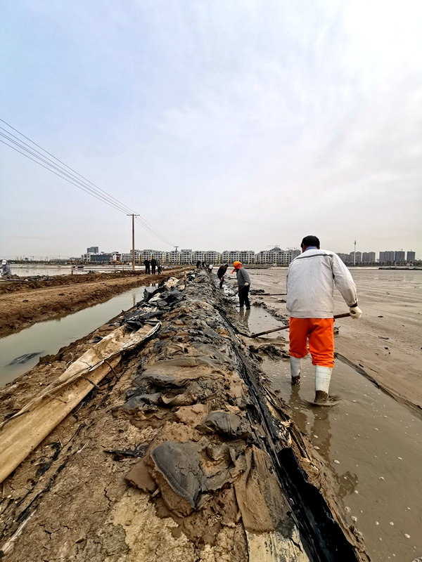 簡(jiǎn)單交流后得知,東灘4組要趕在月底之前,將原來用作復(fù)曬的格塊重新改為結(jié)晶池,搶抓旺季增加產(chǎn)量,而東灘人員少,工作量大,僅憑現(xiàn)有的10余名職工,等改造完了灘地,可能就已進(jìn)入了雨季,無奈之下請(qǐng)海州灣公司伸出援手。