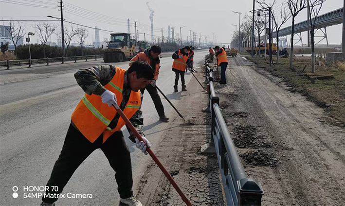 3月15日,該分公司近15余名黨員突擊隊(duì)員,在黨支部號召下,無視春光照曬、三人一組、兩個(gè)一對、揮動(dòng)手中鐵銑,無懼泥土揚(yáng)塵四起,清除蘇海路,港前卡口護(hù)欄下車輛拋灑泥土2000多米長,人工清掃護(hù)欄內(nèi)石子30多處,車輛轉(zhuǎn)運(yùn)20多車。黨員陳小軍、陳海彬等同志盡管手磨破了,仍然堅(jiān)守道路最前沿,經(jīng)過30余名隊(duì)員兩天持續(xù)奮戰(zhàn),整潔靚麗的路面再次展現(xiàn)石化園區(qū)。